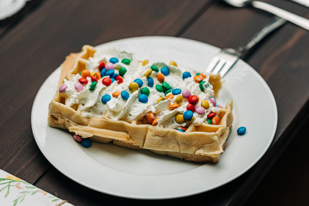 Im Anschluss an die kirchliche Trauung ging es mit der kompletten Truppe zur Hochzeitslocation Gare du Neuss für die eigentliche Hochzeitsfeier. Ein wirklich sehr cooles, umgebautes Industriegebäude. Überall auf den Tischen und im großen Festraum fand sich selbst gestaltete Deko von den beiden. Und da Janina neben dem Singen auch Kindergeburtstage organisiert, gab es auch ordentlich was für die Kleinen. Von Waffeln mit Smarties von der Waffelbar bis hin zu einer großen Hüpfburg zum Gas geben.