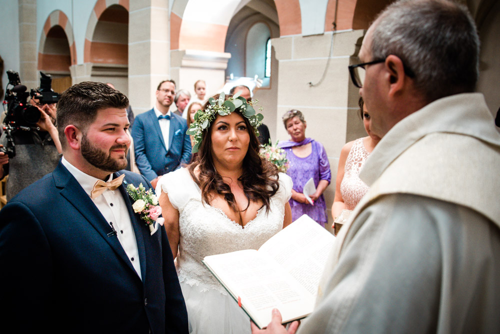Die Alt St. Martin Kirche im beschaulichen Kaarst war sehr hübsch. Allerdings auch nicht gerade groß. Und so schien das Gebäude ein wenig überfordert mit dem bevorstehenden Andrang. Ich hatte mir sagen lassen, dass “normalerweise” ca. 40-50 Gäste dort Platz haben. An diesem 13. April waren ca. 80 Gäste hier, plus Pfarrer, Messdiener, ein musikalisches Quartett, einige von RTL inkl. eines dreizehn köpfigem Kamerateams, ein persönlicher Videograf des Paares, natürlich die beiden verliebten Hauptdarsteller und aus Remscheid die Hochzeitsplanerin Elena vom Traufräulein und ich mit meinen Nikons. Es war das erste Mal, dass ich auf einer Hochzeit mit meinem Equipment Minderwertigkeitskomplexe hatte 🙂 Wie auch immer, ich würde die Gesamtsituation in der Kirche mal unter dem Begriff “kuschelig” zusammenfassen. Auch der Pfarrer wird so eine Szene wahrscheinlich nicht allzu oft in seiner beruflichen Laufbahn haben, aber er blieb sehr gelassen.