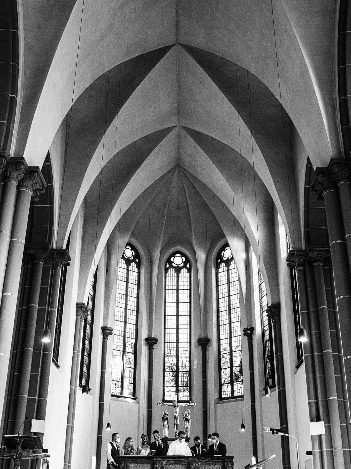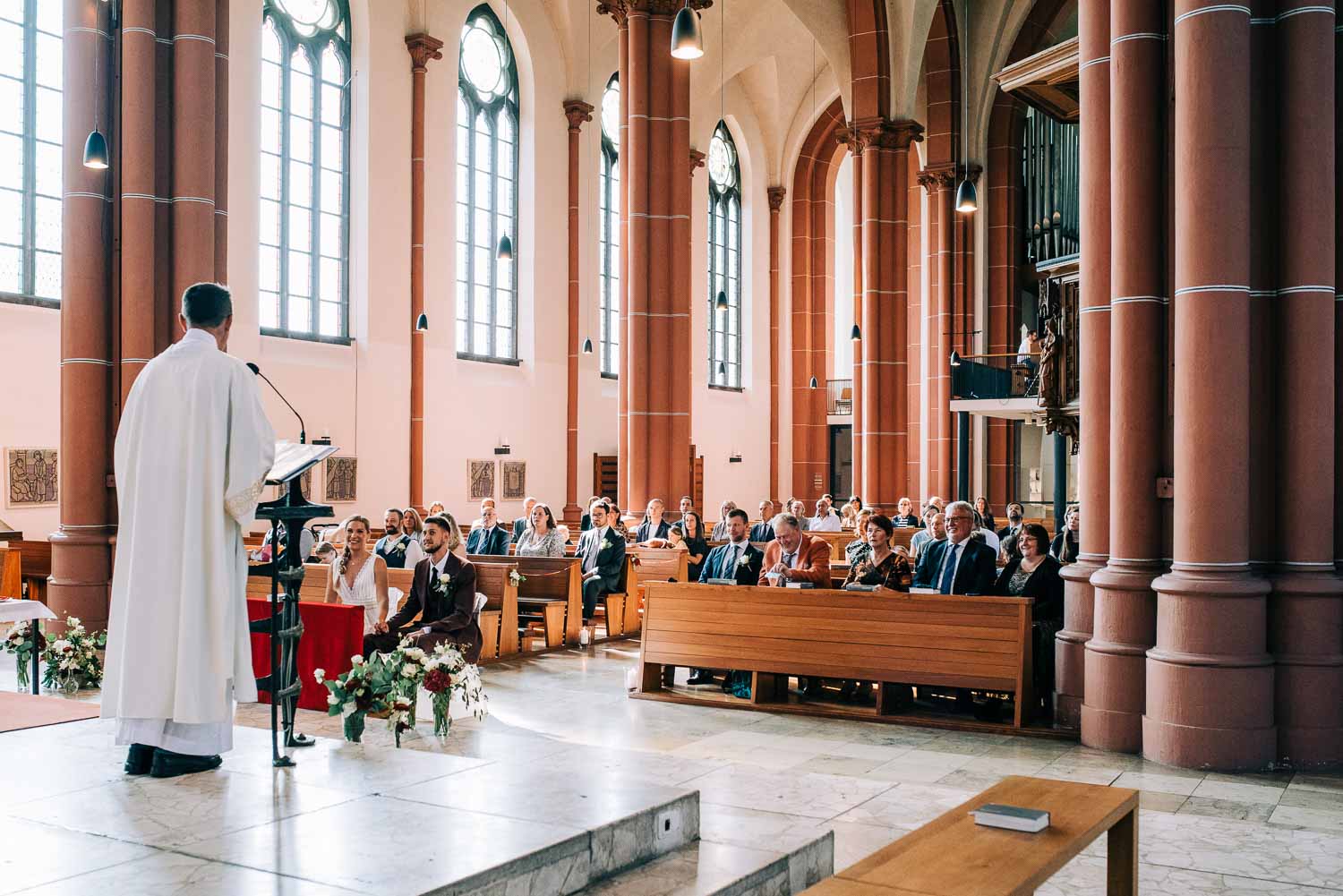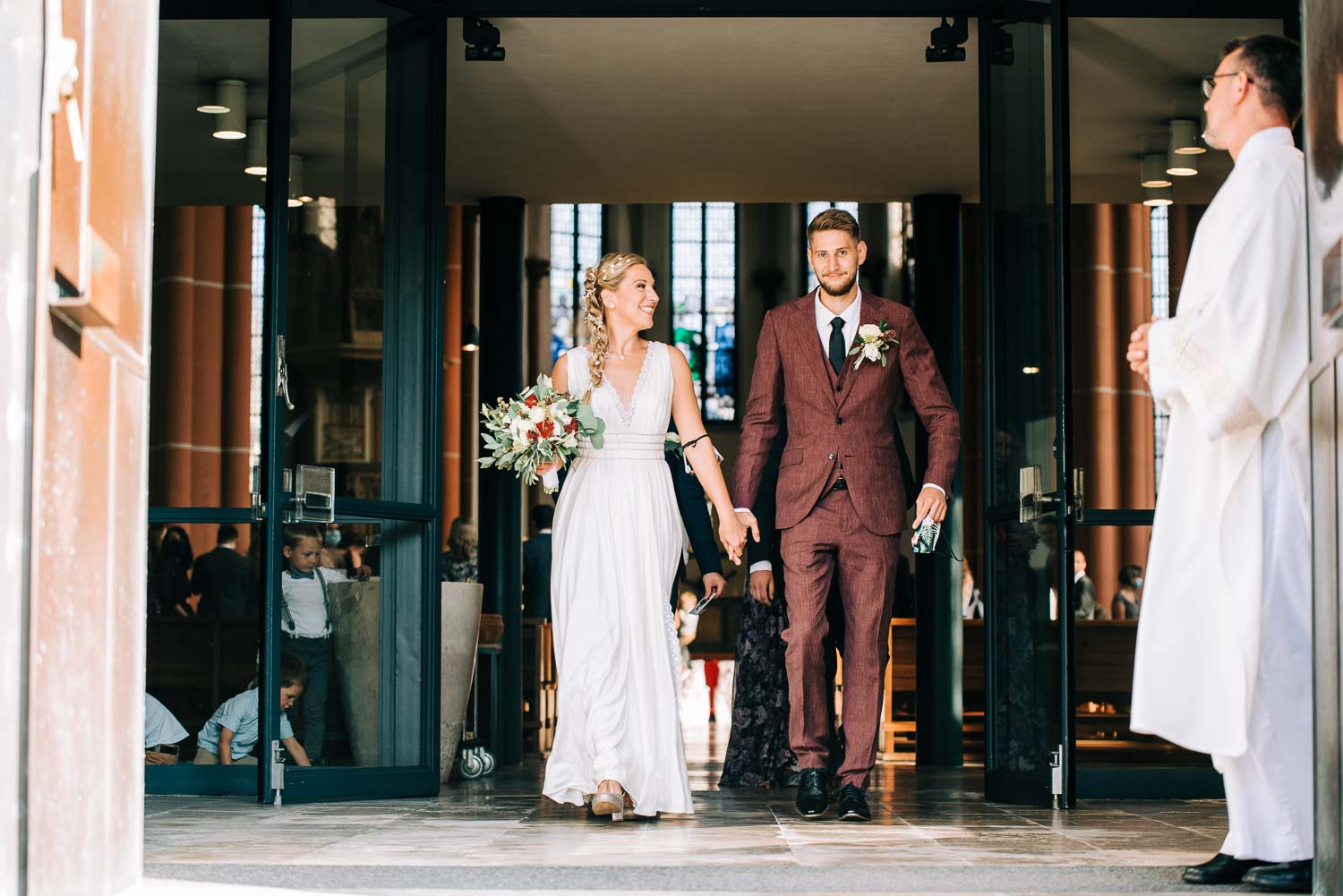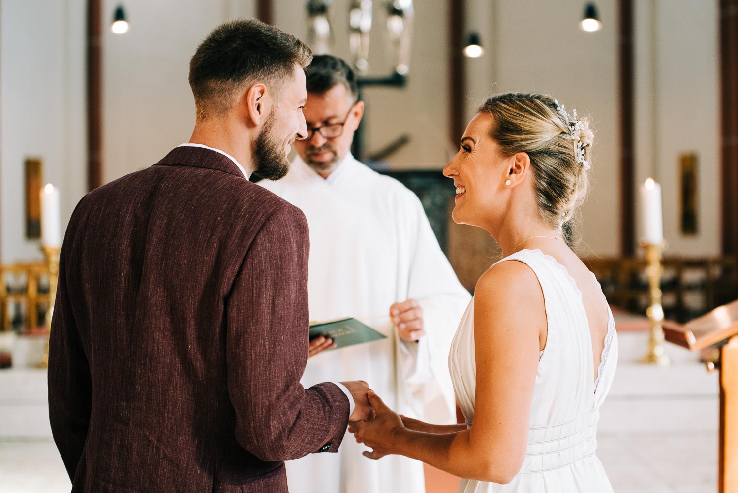 Fakt ist, Clara sah mit ihrem ganzen Styling und in dem Kleid, das ihre unfassbar talentierte Cousine geschneidert hatte, wie eine Göttin aus. Ich hoffe, dieser Ausdruck wird mir in dem kirchlichen Kontext nicht als Blasphemie ausgelegt, aber sie war so hübsch, dass es einfach kein anderes Wort für sie gab. Und das war vor allem auch Christian, der ebenfalls mega chic in seinem Rot-Aubergine farbenen Anzug aussah, nicht entgangen. Es war eine traumhaft schöne Trauung in der Kirche St. Clemens in Solingen mit so viel Rührung.
