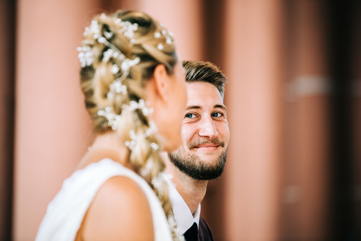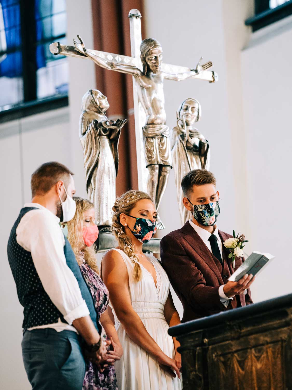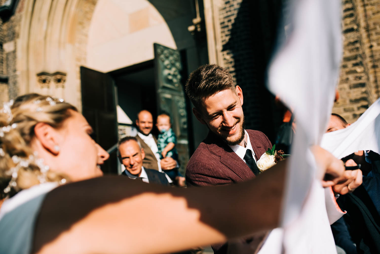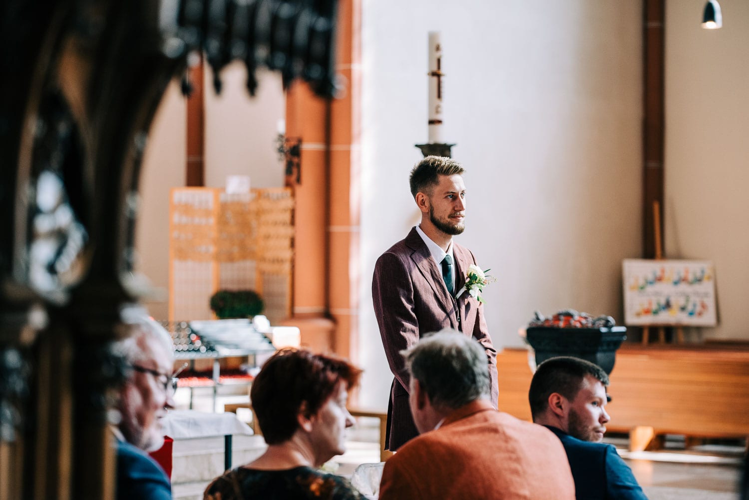 Fakt ist, Clara sah mit ihrem ganzen Styling und in dem Kleid, das ihre unfassbar talentierte Cousine geschneidert hatte, wie eine Göttin aus. Ich hoffe, dieser Ausdruck wird mir in dem kirchlichen Kontext nicht als Blasphemie ausgelegt, aber sie war so hübsch, dass es einfach kein anderes Wort für sie gab. Und das war vor allem auch Christian, der ebenfalls mega chic in seinem Rot-Aubergine farbenen Anzug aussah, nicht entgangen. Es war eine traumhaft schöne Trauung in der Kirche St. Clemens in Solingen mit so viel Rührung.