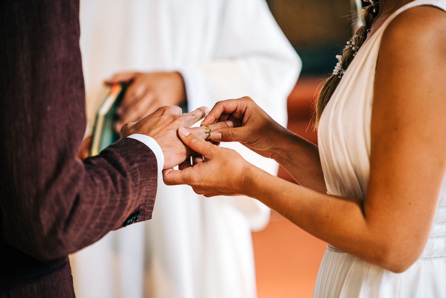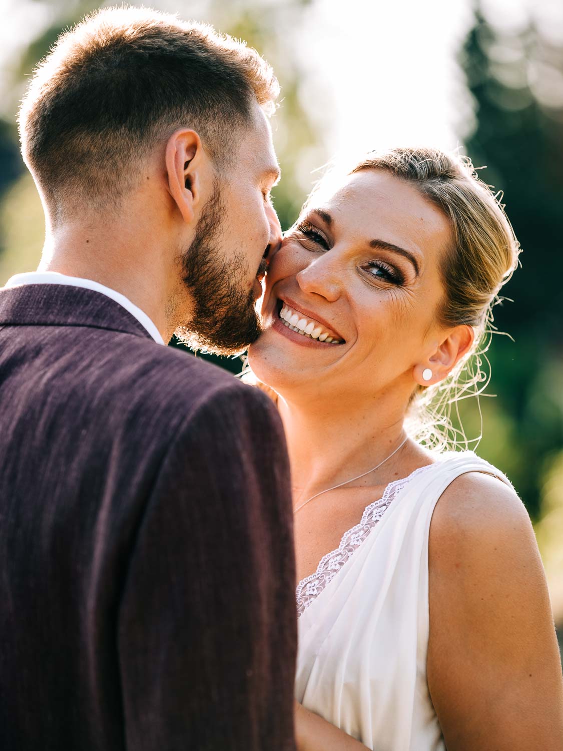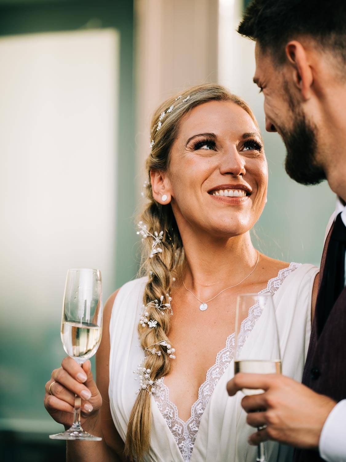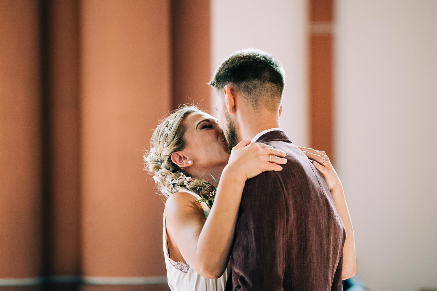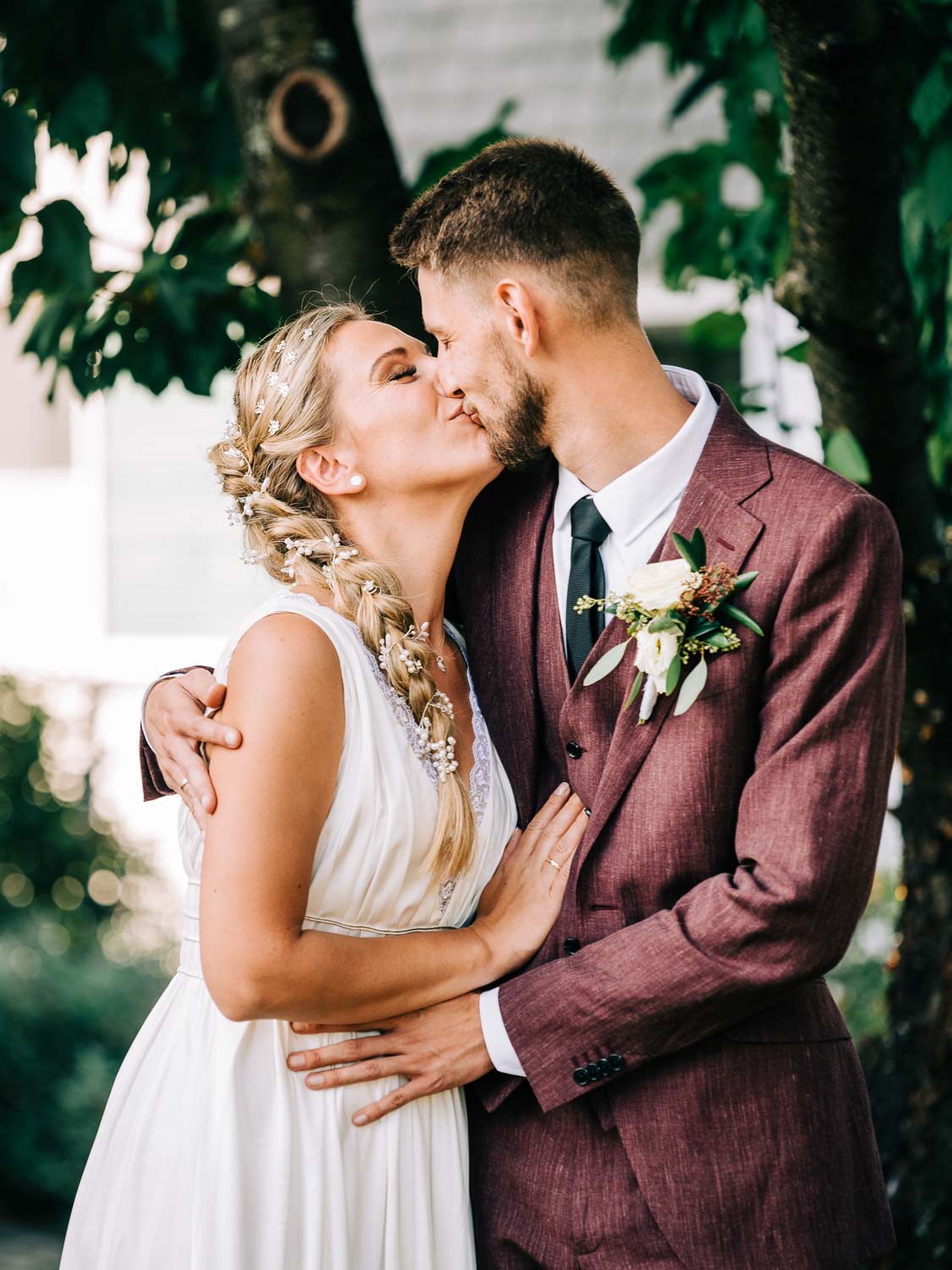 Fakt ist, Clara sah mit ihrem ganzen Styling und in dem Kleid, das ihre unfassbar talentierte Cousine geschneidert hatte, wie eine Göttin aus. Ich hoffe, dieser Ausdruck wird mir in dem kirchlichen Kontext nicht als Blasphemie ausgelegt, aber sie war so hübsch, dass es einfach kein anderes Wort für sie gab. Und das war vor allem auch Christian, der ebenfalls mega chic in seinem Rot-Aubergine farbenen Anzug aussah, nicht entgangen. Es war eine traumhaft schöne Trauung in der Kirche St. Clemens in Solingen mit so viel Rührung.