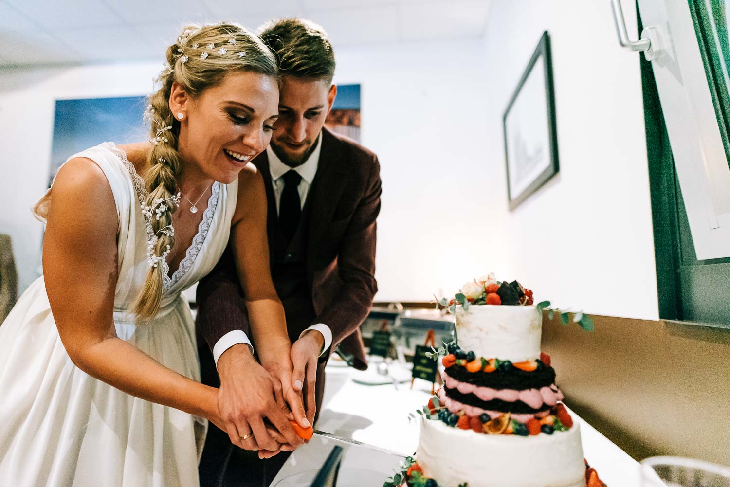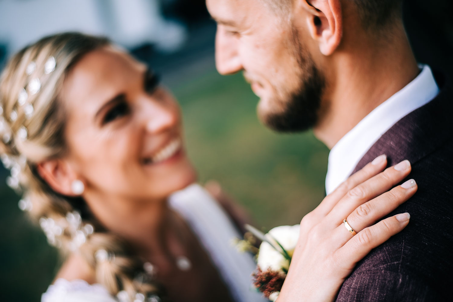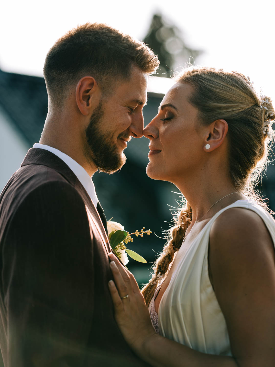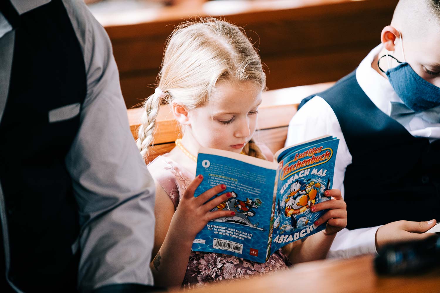 Fakt ist, Clara sah mit ihrem ganzen Styling und in dem Kleid, das ihre unfassbar talentierte Cousine geschneidert hatte, wie eine Göttin aus. Ich hoffe, dieser Ausdruck wird mir in dem kirchlichen Kontext nicht als Blasphemie ausgelegt, aber sie war so hübsch, dass es einfach kein anderes Wort für sie gab. Und das war vor allem auch Christian, der ebenfalls mega chic in seinem Rot-Aubergine farbenen Anzug aussah, nicht entgangen. Es war eine traumhaft schöne Trauung in der Kirche St. Clemens in Solingen mit so viel Rührung.