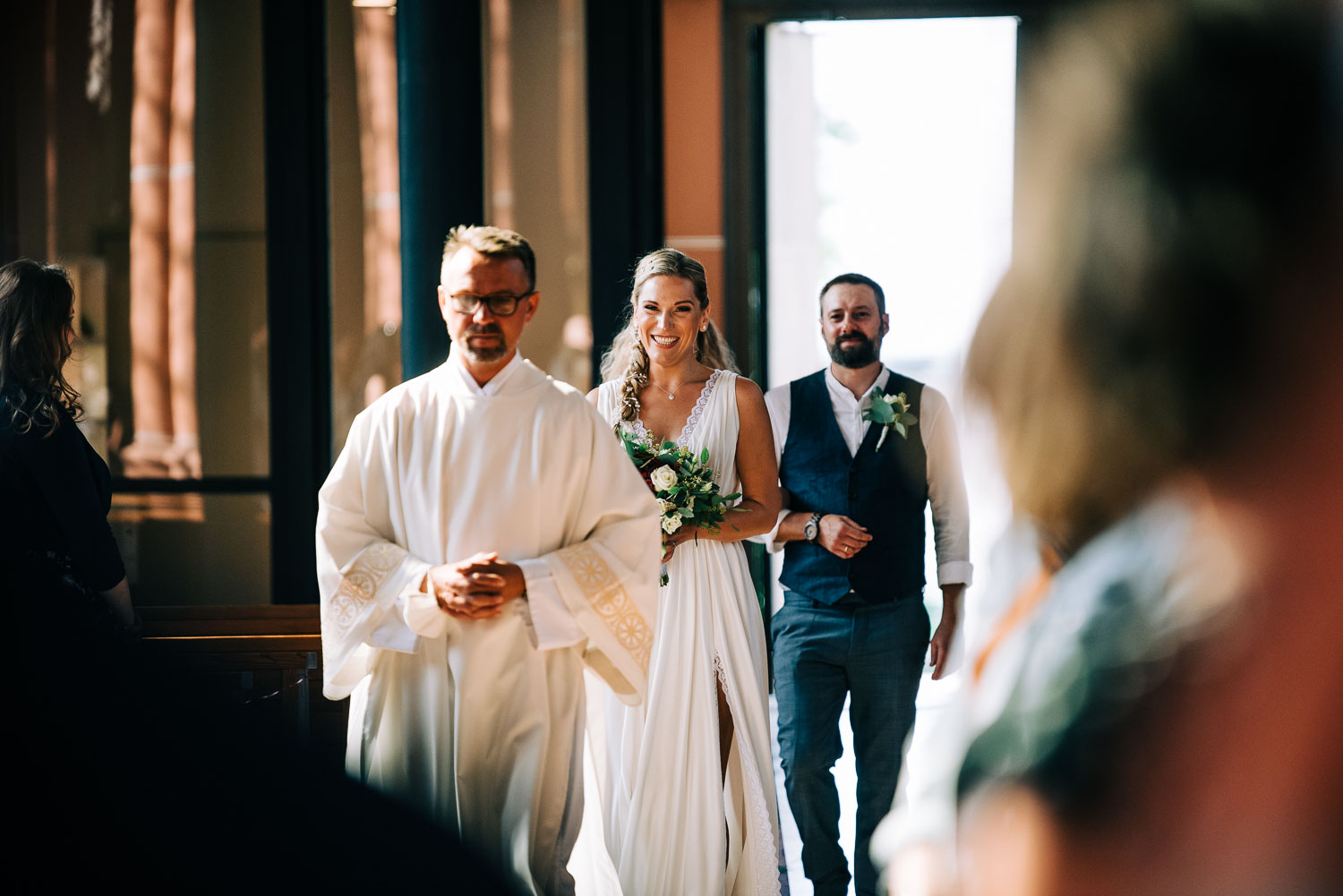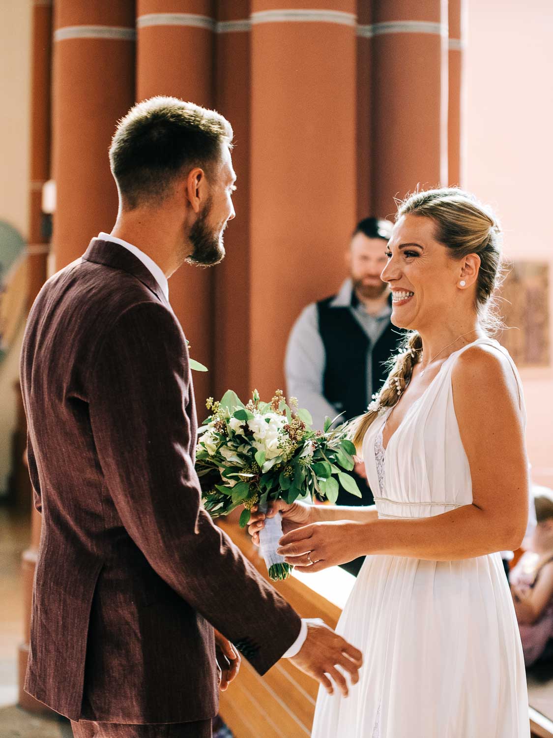 Ich hab immer ein wenig Mitleid, wenn der Augenblick kommt und der nervöse Bräutigam vorne alleine am Altar steht, während alle Augen in der Kirche auf ihn gerichtet sind. Doch dann kommt die strahlende Braut herein und es ändern sich schlagartig zwei Dinge. Das erste - sorry guys - ist, dass der Bräutigam ziemlich schnell an Aufmerksamkeit verliert, weil alle Blicke nun auf die Braut gerichtet sind. Der zweite noch viel wichtigere Punkt ist, dass du als Beobachter förmlich das Band und die Spannung zwischen dem Brautpaar erkennen kannst. Die beiden sind völlig im Tunnel, du hörst gedanklich dramatische Filmmusik und während die beiden im Spotlight aufeinander zu schweben, wird die Umgebung ausgeblendet … Ok, an dieser Stelle hab ich mich gerade hinreißen lassen - aber es ist wirklich ein fantastischer Moment:)!