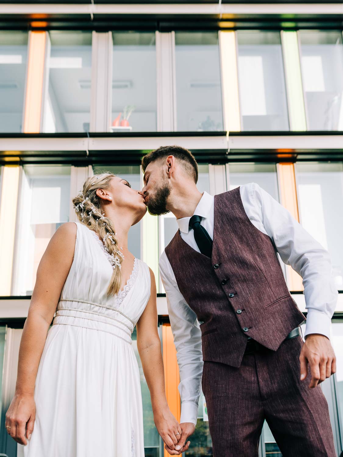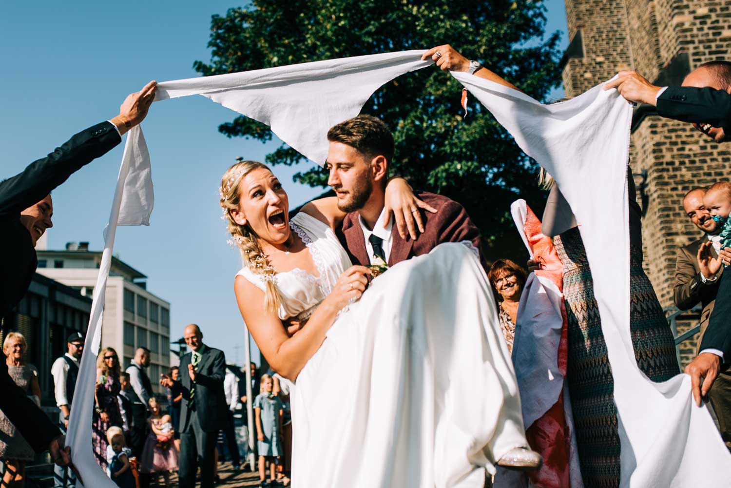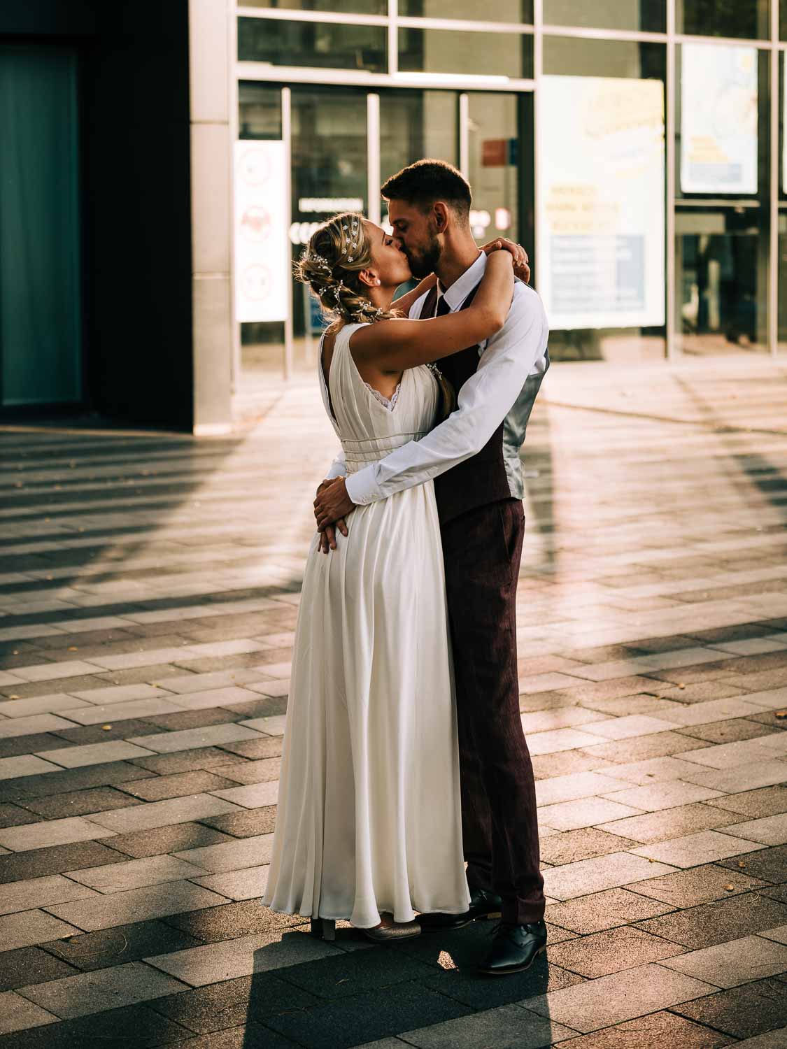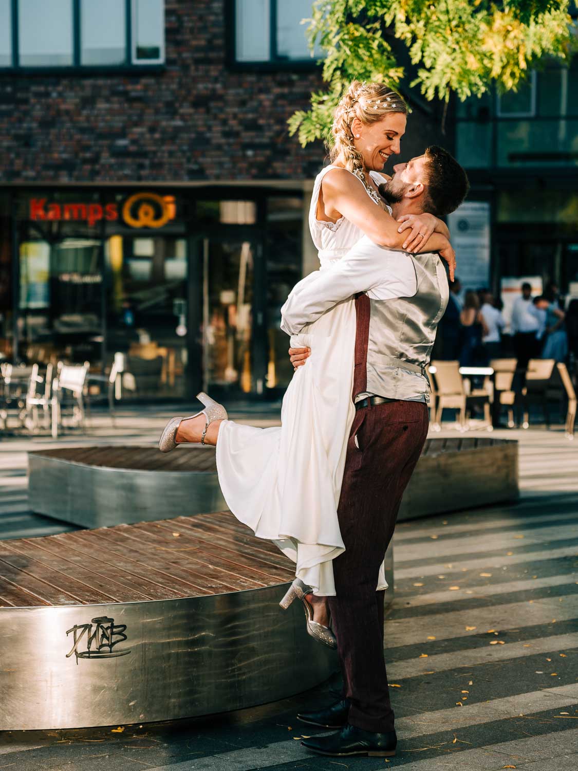 Nach dem quirligen und lustigen Geschehen auf dem Kirchvorplatz hatten wir noch einen kurzen Abstecher für ein paar Bilder. Bevor es im Anschluss im Cologne’s in Solingen weiterging. Es war so ein fantastisches spätsommerliches Wetter, dass sich die Hochzeitsfeier eigentlich hauptsächlich vor der lockeren Location mitten in der Solinger City abspielte. Und da wir ja gerade schon gedanklich beim Kino waren. Leute, was Christian mitten auf dem Platz abgezogen hat - WTF!!! Da würde ich glatt meinen Hut ziehen. Wenn es nicht gehießen hätte: “You can leave your hat on”. Er hat sich in einer absolut abgefahrenen Nummer das Strumpfband seiner Liebsten erobert. So eine coole Show von den beiden. Da konnte selbst der grandiose Hochzeitstanz später nicht mehr gegen ankommen …