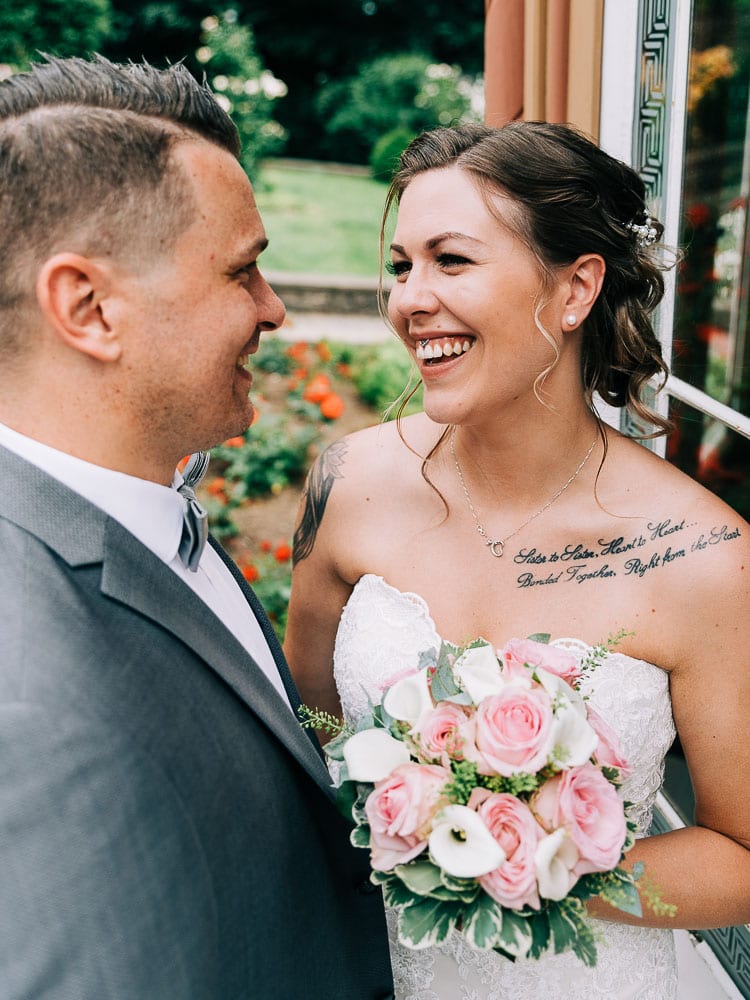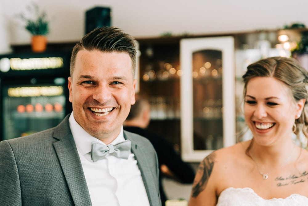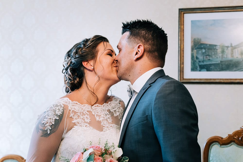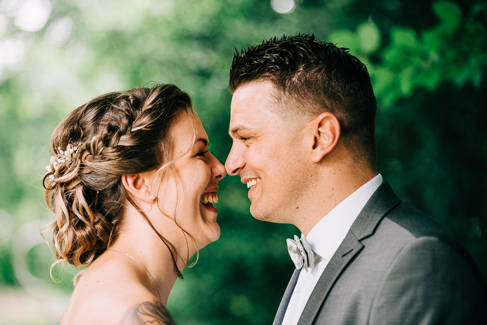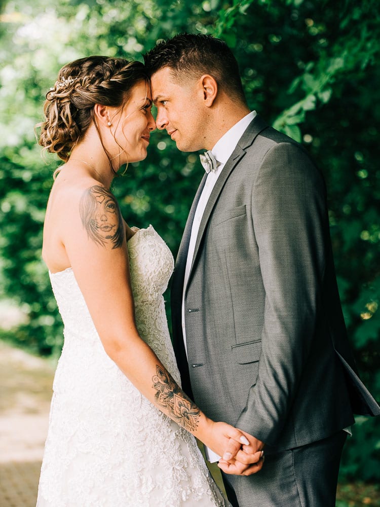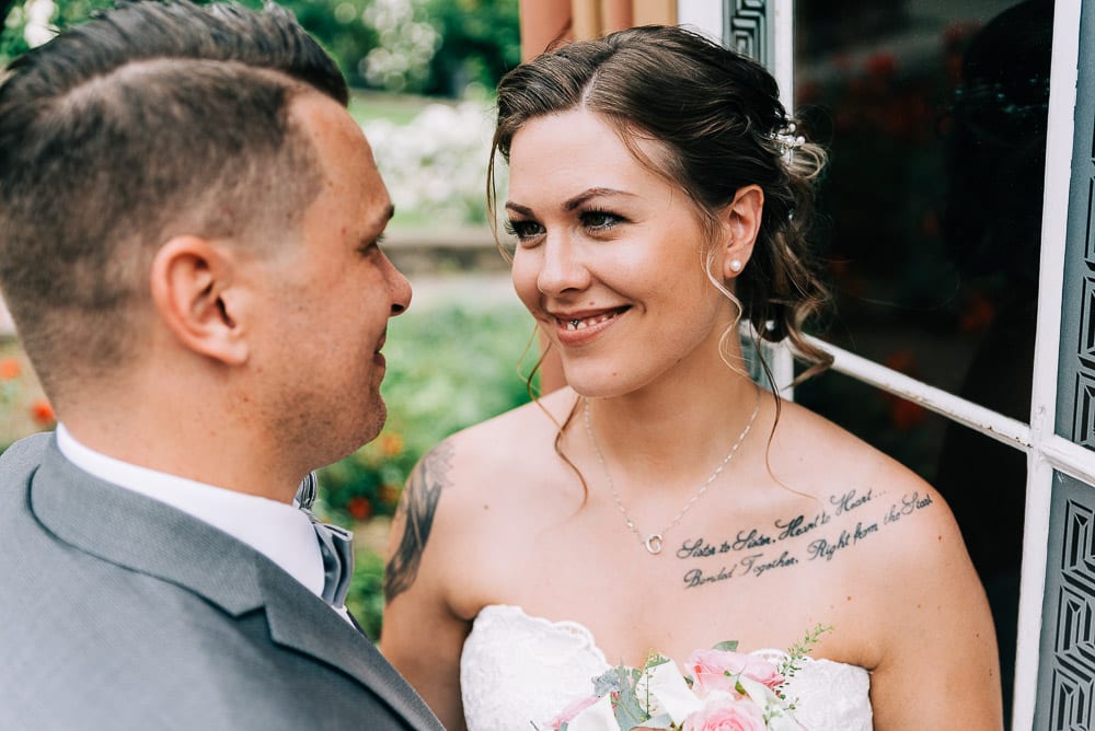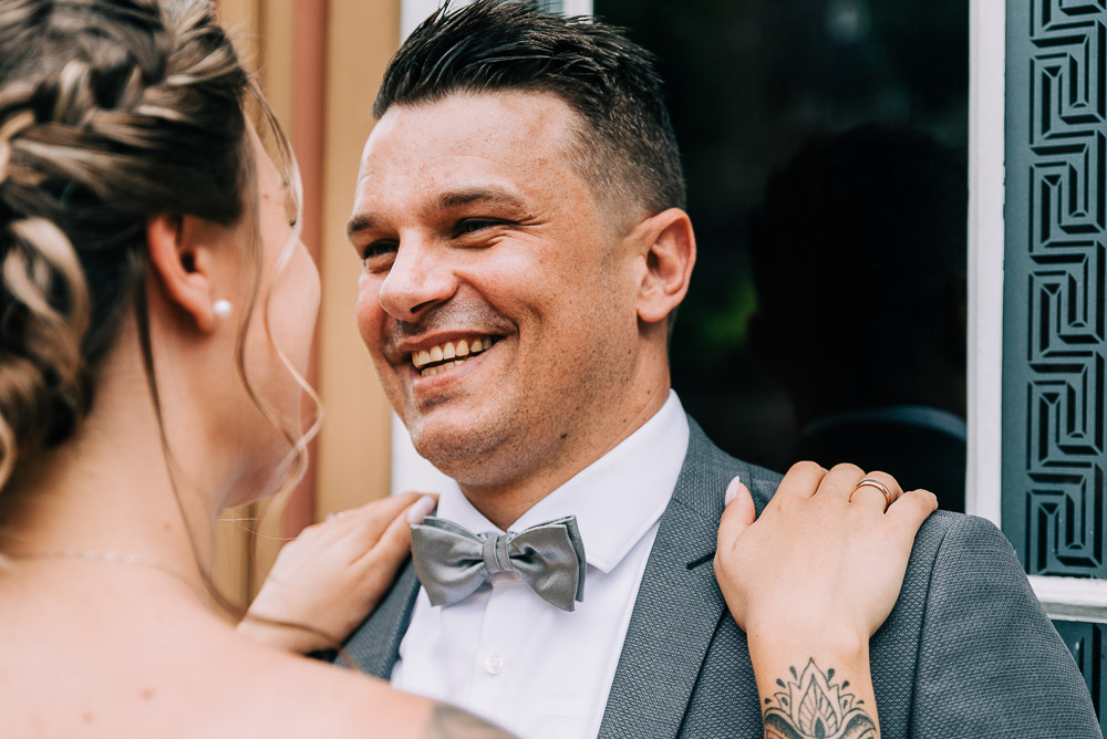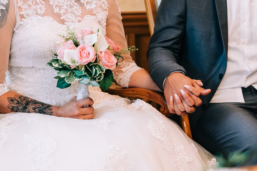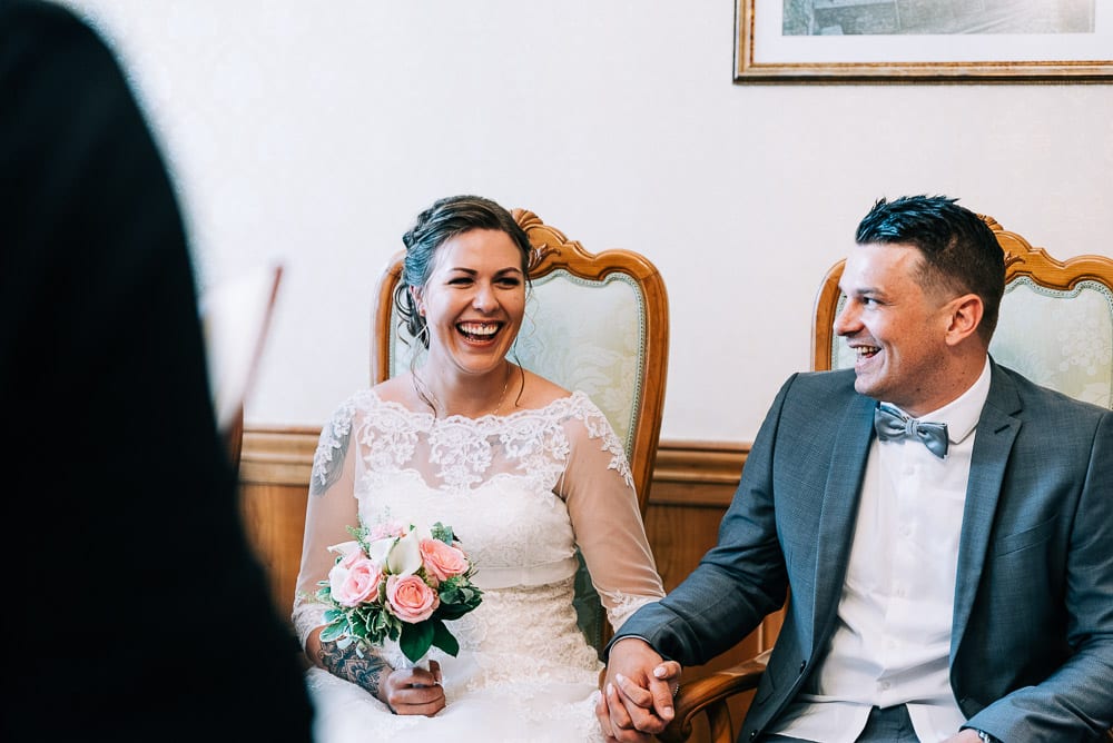 Bei der standesamtlichen Trauung im Obergeschoss des Schloss surrte beim Betreten schon der Ventilator und die Fenster waren weit aufgerissen. Die Sonne hatte den Raum in eine kleine Sauna verwandelt. Doch das tat der herzlichen Stimmung keinen Abbruch. Mona und Dennis hielten fast während der gesamten Zeremonie Händchen und strahlten sich an. Ein bisschen gerührt, freute ich mich meine feuchten Augen hinter der Kamera verstecken zu können 🙂
