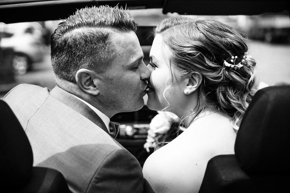 , hat der Ort vorgesorgt und stellt sich gleich als “Schloss-Stadt Hückeswagen” vor.Auf dem Parkplatz traf ich Dennis, der mich schon mit lauter Vorfreude auf den Tag mit seinen beiden Jungs begrüßte. Zusammen schmückten die drei noch das Golf Cabrio, damit alles fertig war, wenn Mona eintrifft. Dennis und seine Kids haben sich für einen einheitlichen, coolen Style in Sachen Schuhe entschieden und kamen allesamt mit weißen Nikes daher. Als Mona schließlich vorfuhr, war die Aufregung in der Luft was spürbar. Sie hatte dieses einmalige “Brautleuchten” und war ganz schön nervös:)
