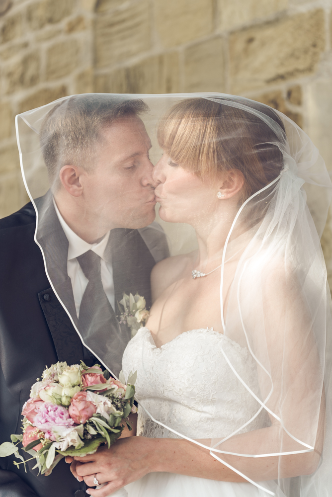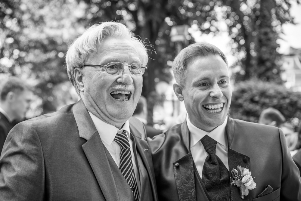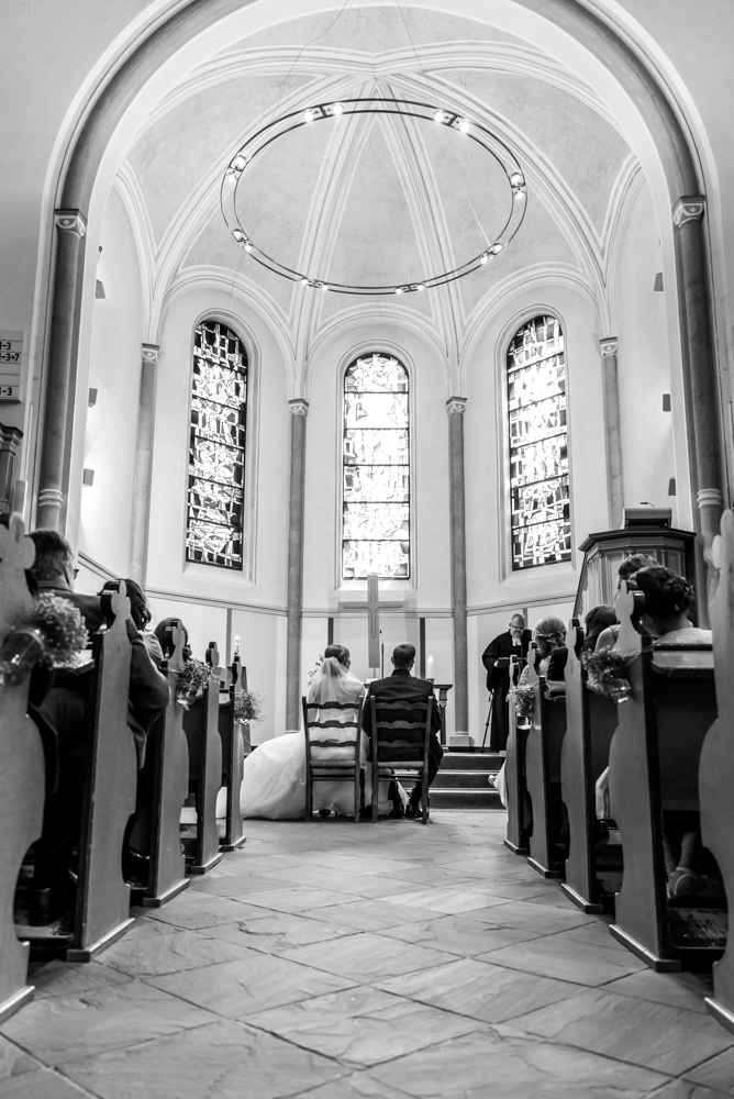 Wieder zurück in Haan wartete der Bräutigam Daniel bereits mit den Gästen in der Kirche als Lea mit ihrer Familie auf den Kirchplatz vorfuhr. Braut und Brautvater tippelten ein wenig außer Sicht vor dem Kirchentor bis zum großen Moment. Die Zeremonie war auch dank des netten Pfarrers und der musikalischen Highlights sehr emotional und trotzdem aufgelockert.