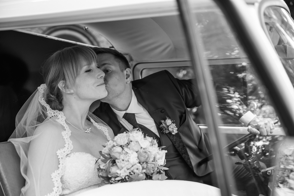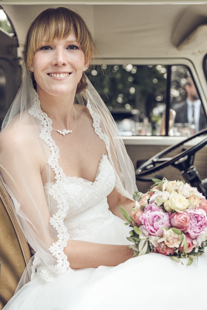 Draußen empfingen die Freiwillige Feuerwehr das Brautpaar mit einem historischen Löschzug. Außerdem stand auch schon die Bullibar für den Sektausschank bereit. Die Stimmung auf dem Vorplatz war schon so gut, dass man fast hätte vergessen können, dass es für die Feier und da Portraitshooting wieder zurück nach Solingen ging.