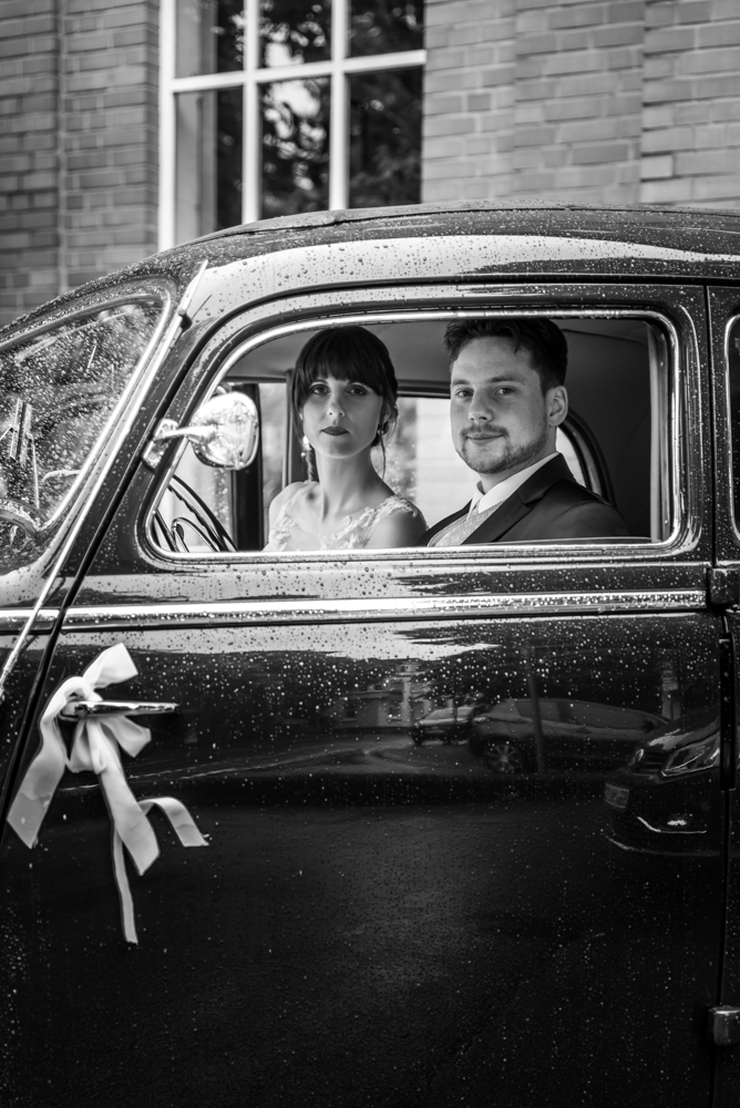 Nach der standesamtlichen Zeremonie hellte der Himmel ein wenig auf, auch wenn der erste Teil unseres Portraitshootings in der Umgebung nicht ohne einige dicke Tropfen von oben auskam. Aber Anne und Michael hatten ja ihr unglaublich fotogenes Hochzeitsauto vor den Toren und somit nutzten wir den geschlossenen Wagen sehr gerne für ein paar schöne Aufnahmen.