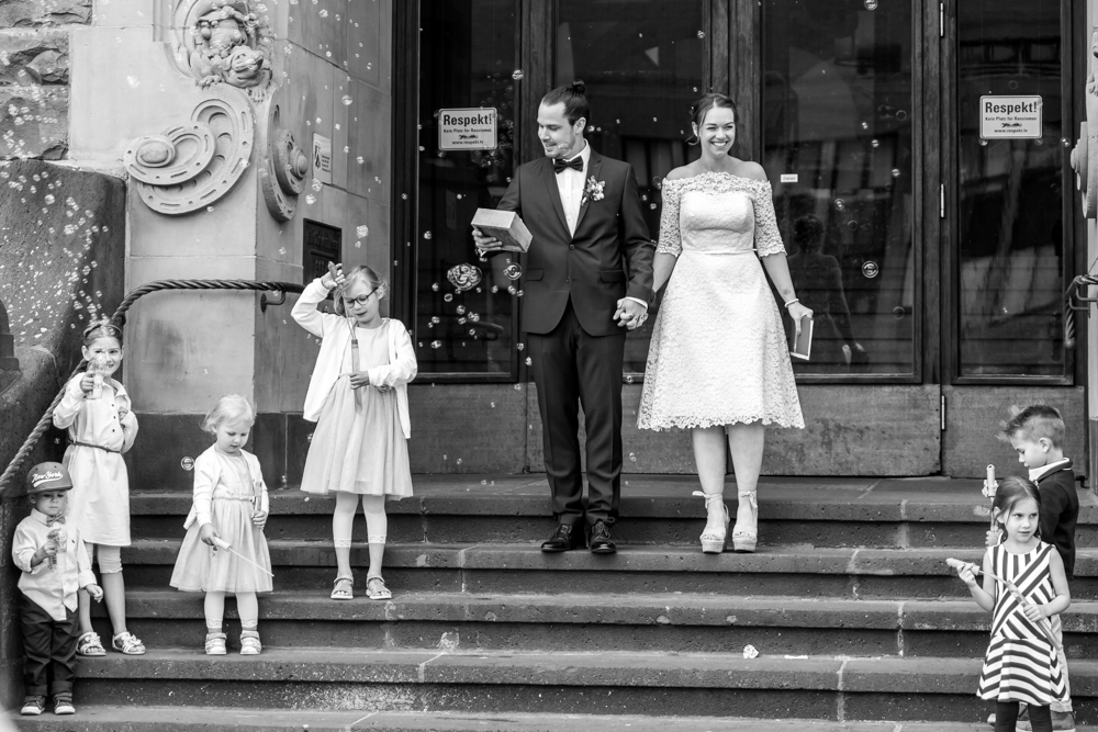Nach dem offiziellen Teil formierten sich alle Gäste der Hochzeit vor dem Remscheider Rathaus mit Banner und Luftballons. Die Kinder nahmen sich mit Leidenschaft ihrer Aufgabe an. Sie tauchten den Treppenausgang in ein Meer aus Seifenblasen, als das frisch vermählte Paar hinaus trat und sich feiern ließ.
