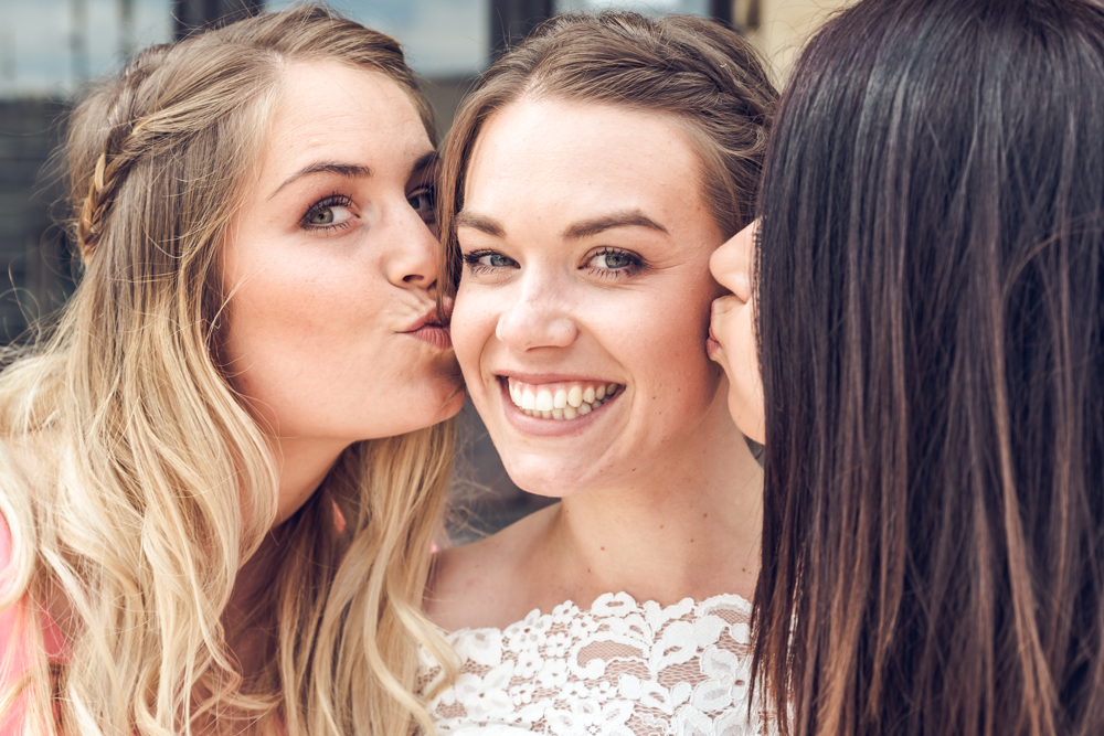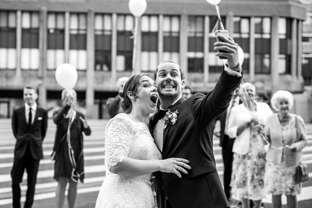 Während die Braut sich zu Hause mit ihren Freundinnen gestylt hat, traf ich mich mit einem (diplomatisch ausgedrückt 🙂 ) semi-nervösen Bräutigam und seinem Trauzeugen auf dem Rathausplatz in Remscheid. Das Maiwetter war in Spendierlaune und die Sonne flutete, perfekt für jede Hochzeit die Remscheider Innenstadt. Auch wenn ich mir als Hochzeitsfotografin zwischendurch eine kleine Wolke als Weichzeichner gewünscht hätte, versprühten die warmen Strahlen doch noch ein Extralächeln in die Gesichter der nach und nach eintrudelnden Hochzeitsgäste.
